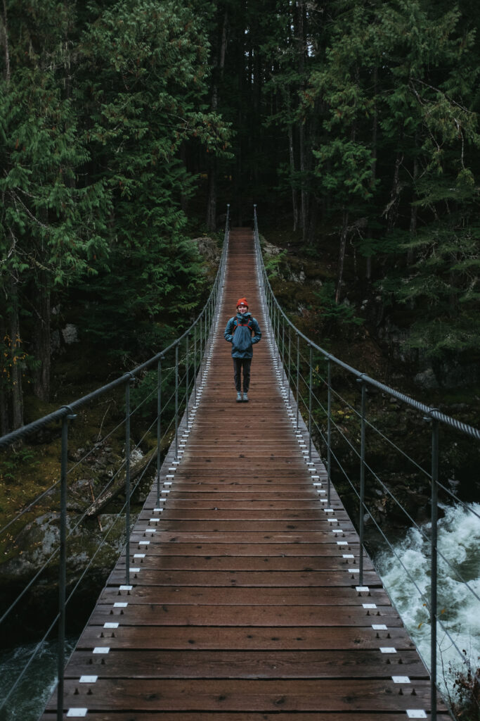 The trail is flat and easy, crossing a spectacular suspension bridge over the Cheakamus River before reaching the wrecks. Allow extra time to explore — most people spend longer here than they expect.